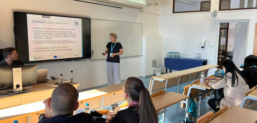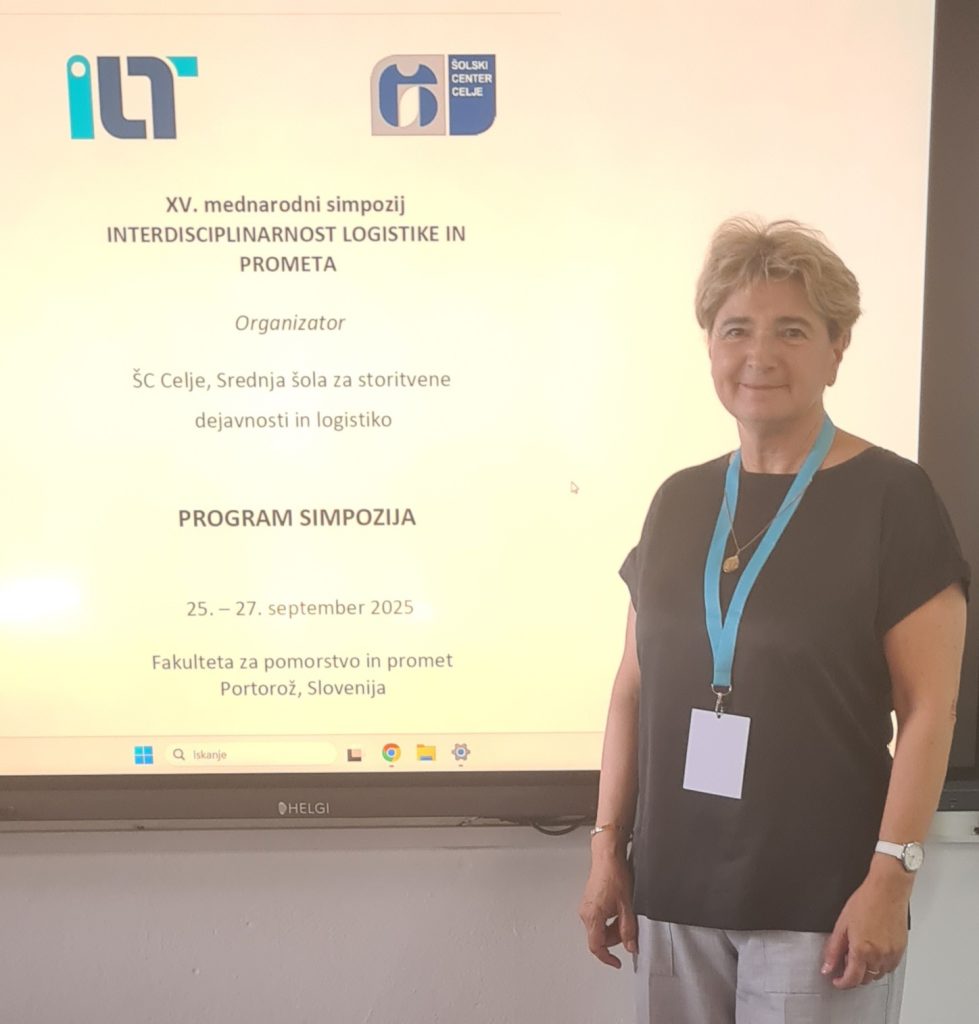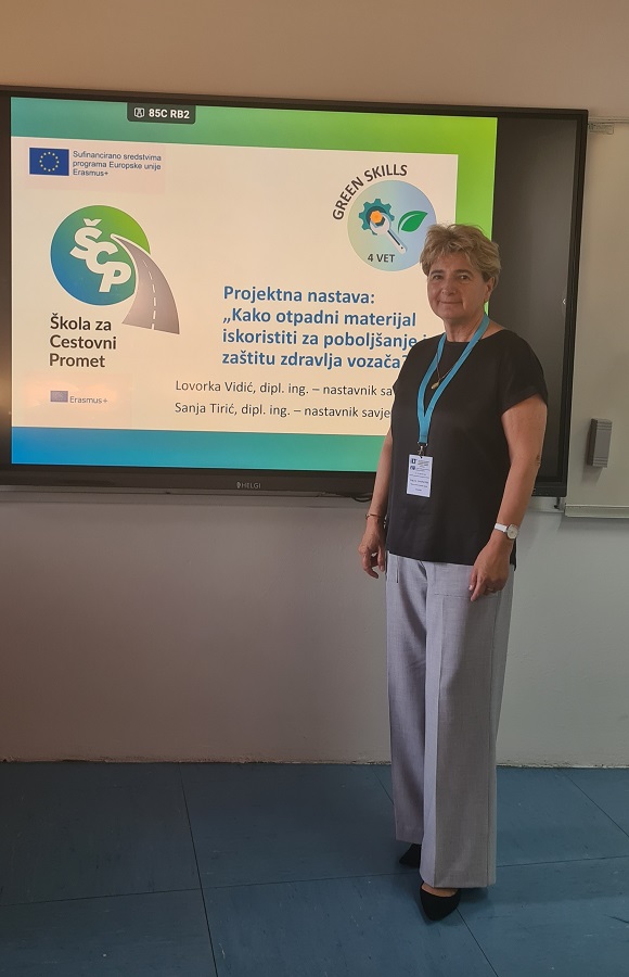 Na simpoziju „Interdisciplinarnost prometa i logistike“, u Portorožu, Slovenija (25. do 27. rujna 2025.), na kojem su se okupili stručnjaci iz obrazovanja u području prometa i logistike i gospodarstvenici, voditeljica projektnog tima u Školi za cestovni promet, Lovorka Vidić, predstavila je stručni rad o projektnoj nastavi, radu na izazovu „Kako otpadni materijal iskoristiti za poboljšanje i zaštitu zdravlja vozača?“, zadatku u okviru projekta Green Skills 4 VET.