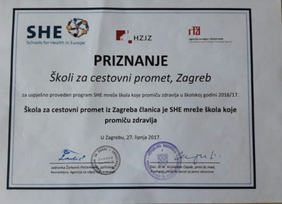 Škola za cestovni promet je 27. lipnja 2017. godine dobila certifikat kao dokaz da je uključena u Europsku mrežu škola koje promiču zdravlje (SHE – Schools for health in Europe).