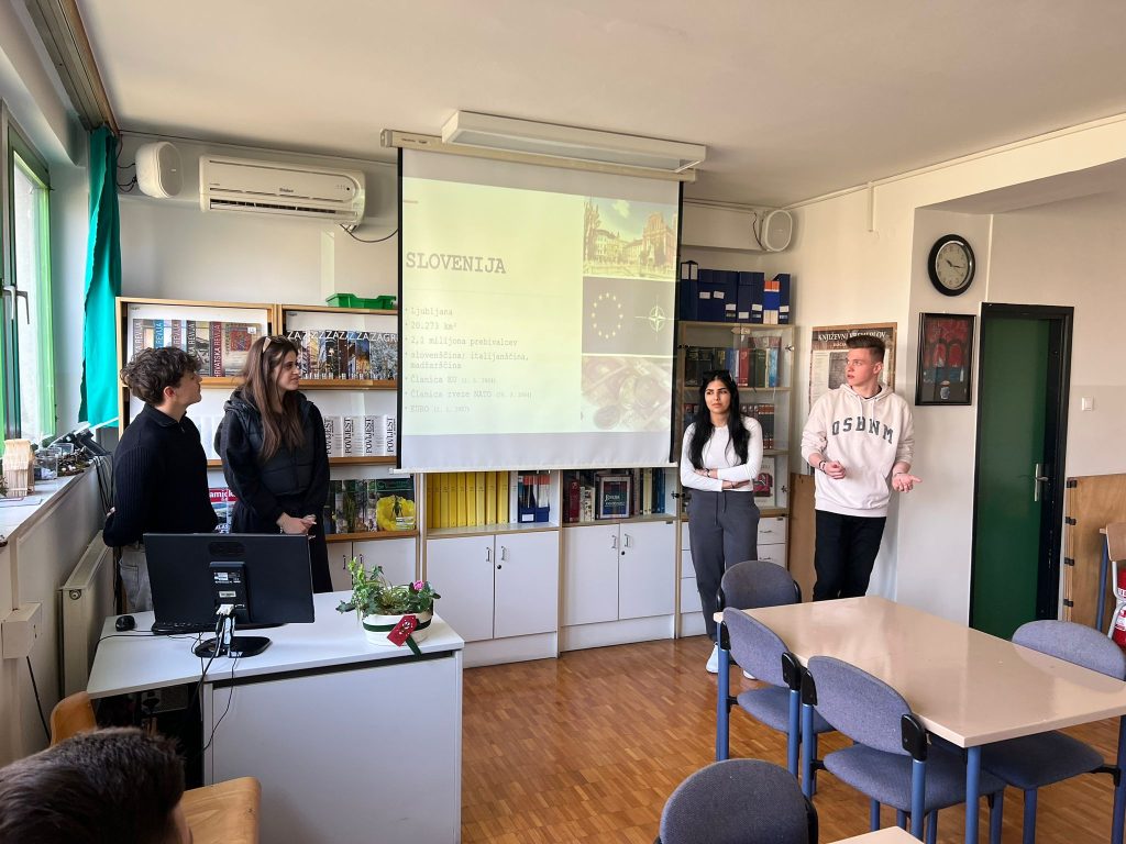 Nastavnik Damir Kranjc i četiri učenika koji pohađaju smjer Tehničar za logistiku u Prometnoj šoli Maribor danas su posjetili našu školu. U školskoj knjižnici učenik Ivan Jurinović u kratkom predstavljanju govorio je o našoj školi dok su slovenski učenici prisutnima govorili o Mariboru i svojoj školi. Nakon predstavljanja učenici su razgledali školske praktikume.