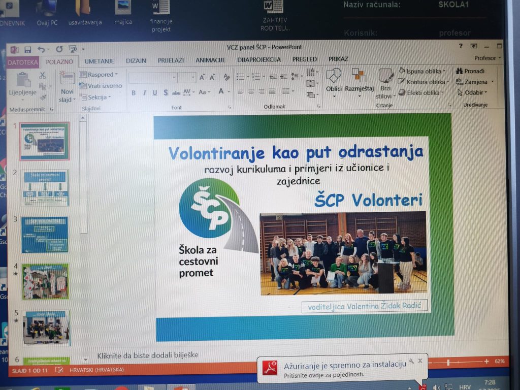 Na panelu je predstavljen projekt “Volonterski put: od vrtića o punoljetnosti”, razmijenjena su iskustva o koristi i izazovima uvođenja kurikuluma o školskom volontiranju te su podijeljeni primjeri dobre prakse. Mi smo predstavili rad naših ŠCP volontera. Partneri u projektu su Dječji vrtić Trnoružica, Zagreb, Osnovna škola Zorke Sever Popovača, Škola za cestovni promet, dok je nositelj projekta Volonterski centar Zagreb. Projekt pod pokroviteljstvom Ministarstva znanosti, obrazovanja i mladih doprinosi stvaranju generacije mladih koji aktivno sudjeluju u zajednici i doprinose izgradnji održive i solidarne budućnosti.